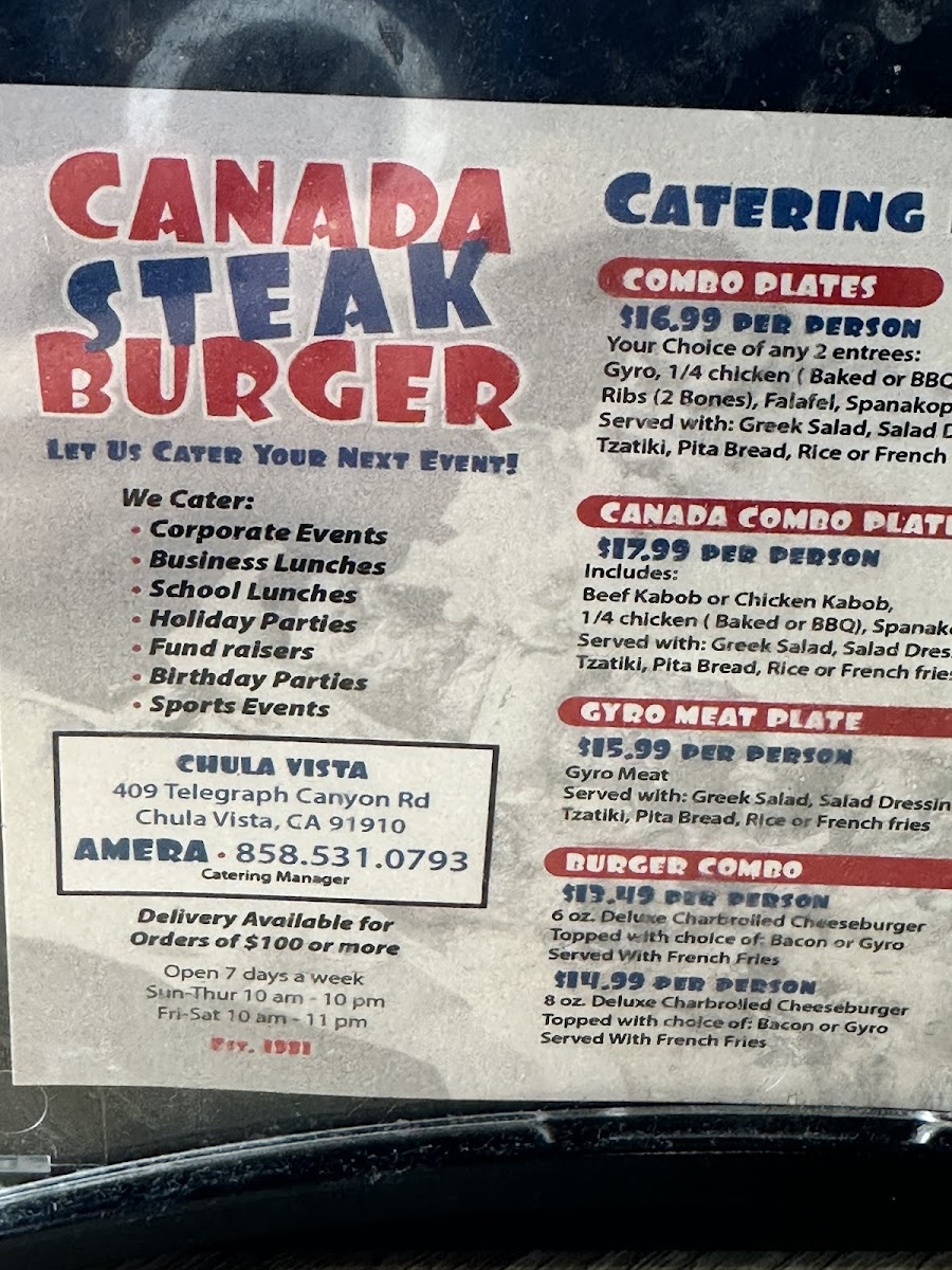 Canada Steak Burger masterfully blends classic American fast food with authentic Greek flavors, creating a unique dining experience in Chula Vista, CA. Their signature steak burgers stand out—juicy, expertly grilled, and bursting with savory depth. Complemented by Greek specialties like the Gyro Sandwich, marinated Souvlaki, and generous Gyro Plates, the menu offers bold, fresh choices that satisfy both burger lovers and aficionados of Mediterranean cuisine.